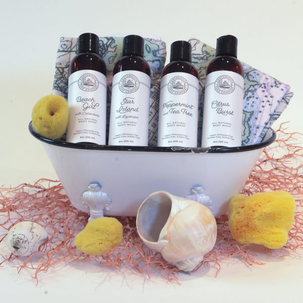 We offer four types of Body Wash, intended to appeal to a variety of preferences. Beach Girl evokes the fun, easy-going days of summer. Peppermint and Tea Tree offers an energizing scent that is ideal for invigorating early work day mornings. Choose our Citrus Burst for a refreshed, rejuvenating scent. For a calm start to the day, lavender scented Star Island is for you. All are made with organic ingredients and enhanced with a variety of essential oils and natural fragrances.