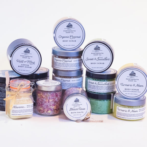 Our body scrubs are made with all-natural ingredients, the finest salts and sugars and filled with essential oils. We have a variety of both dry body scrubs and wet body scrubs. Both help exfoliate your skin while leaving a refreshing and soothing scent.